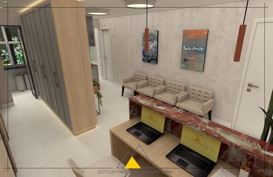 Possui 2 salas de atendimento, 1 sala de pré-exames, recepção, esterilização, copa e lavabo